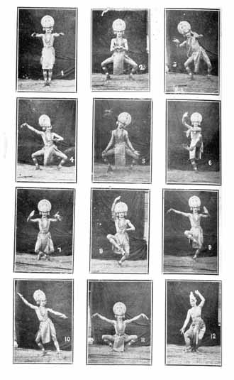 Fig. 3 is from a ‘kalasam’ called ‘rettivattam’ in which the body is flexed now to one side and now to the other with a semi-circular movement, the hands forming alternately a ‘sandamsa’ and ‘alapallava.’ This ‘sandamsa-alapallava’ alternation, corresponding to the ‘hamsasya-alapallava’ combination of the nautch, is the most frequent hand accompaniment to floor contacts in the Kathakali. These very ‘hastas,’ but with an upward direction, occur in the fine picture of Ragini Devi (fig. 12) which illustrates not only the beautiful flexions of a typically feminine attitude, but also the artiste’s easy familiarity with the Kathakali technique.