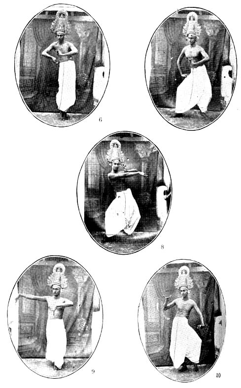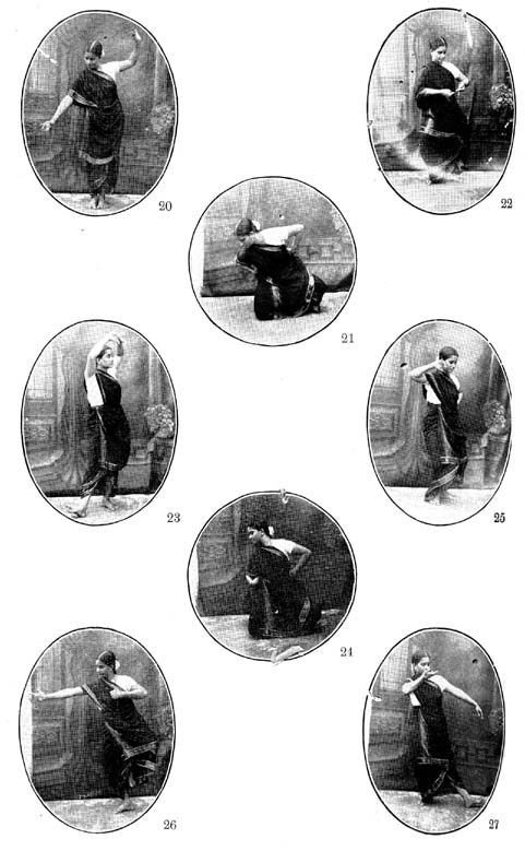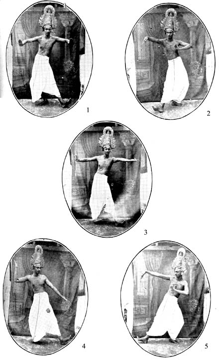 In ‘abhinaya,’ ‘motitam’ denoted the sweet reluctance of woman–one of the meanings of the Tamil word ‘modi.’ From the acrobatic bend the Tamil word ‘modi’ derived another sense. Tamil is indebted to dance for the word ‘oyyarum’ from the ‘oyarakam’ that denoted the oblique lowering of the head (fig. 20)–one of the ‘desi-lasyangas’ of Sarangadeva. These ‘lasyangas’ occur in other compositions of the Nautch, but principally in the ‘tillana’; also in the ‘kinjin’ and ‘modi’ of the dramatic traditions. The karanas ‘parivrittam’ and ‘gandasoochi’ are shared by most South Indian systems.