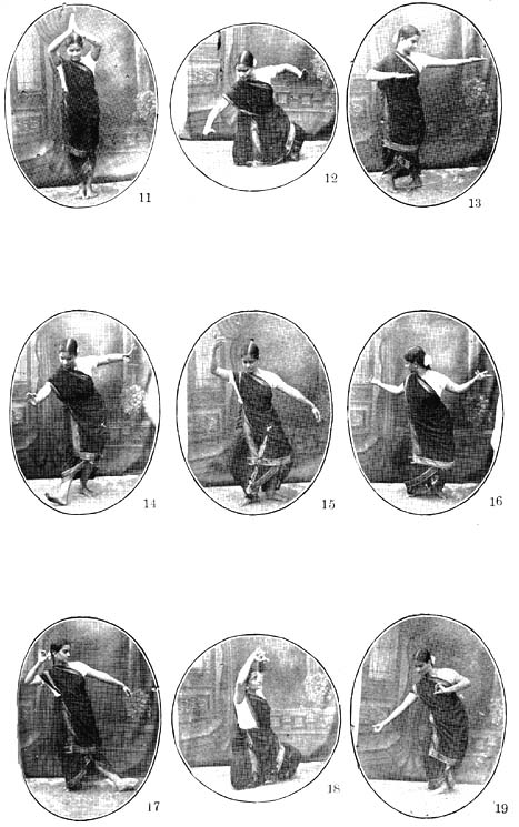 The next item ‘varna’ is the most elaborate composition of the Nautch. In structure it does not differ very much from the ‘varna’ of music, though the music, in common with other ‘sahityas’ of the Nautch, is superior. Here again is a preliminary ‘tirmana’ and ‘tirmanas’ between one section and another. The ‘tirmanas’ of the ‘varna’ are ampler and possess considerable elements of beauty, embodying as they do come of the most beautiful cadences of hands and feet (figs. 1, 16 & 19) The ‘abhinaya’ also is more minute and detailed, and the balance between ‘nritta’ and ‘nritya’ is perfectly maintained except in the ‘charana’ section where there is a release into ‘nritta’ phantasies embodying a great variety of foot-movements and rhythmic variations–a sudden flood of ‘nritta’ overwhelming the tide of ‘abhinaya’– rather Dance which had been enchained to sense and given the lowly office of interpretation, breaking free of the bondage and setting the pace for Music, while Music is content to meekly follow from a distance. This ‘nritta’ crescendo for which the ‘sahitya’ passage is just an afterthought is the most beautiful part of the ‘varna.’ If the modern reformer would un-sex ‘lasya’ and make it accommodate themes he considers appropriate, here also he finds the ‘nritta’ superfluous and best lopped off. Did not the late Dr. Vincent Smith think the beautiful forearm–the ‘karihasta’–of the Nataraja superfluous and recommend its amputation?