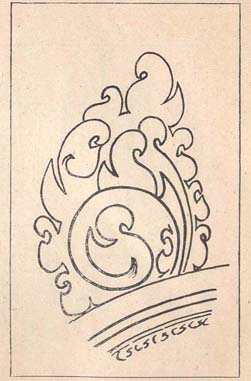 In all the carvings at Angkor, and in the monuments near by at their best period, there is a theme which is very significant. It is represented by Fig. 4. Again and again this is worked out in very beautiful forms. We find it also In Fig. 5, which reproduces a Devi. On the right side is a very beautiful panel in sandstone. One characteristic of all the work at Angkor Vat is a beautiful fineness and finish which one rarely finds in Indian temples built of granite.