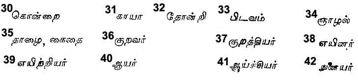 The first two months of the year, ‘Chittirai’48 and ‘Vaikasi’49 comprise the ‘Ila-venil’50 or spring season, the next two months of Ani51 and Adi,52 the Mudhu-venil53 or summer season, the next two months of Avani54 and Purattasi,55 the Kar,56 or rainy season, the next two months of Aippasi57 and Karthigai,58 the Koothir59 or cold season, the next two months of Margali60 and Thai,61 the Mun-pani62 or the season of the evening dews and the last