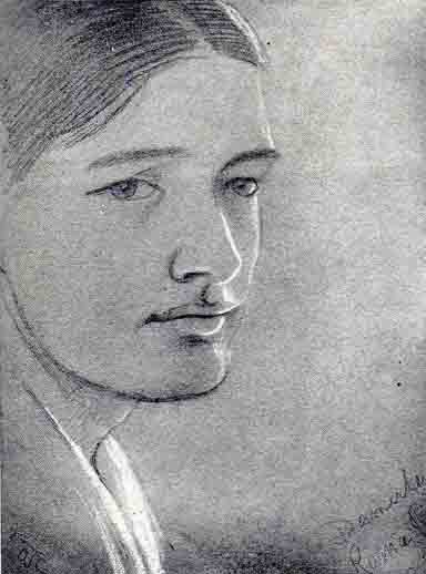 Among my treasured memorials of Rama Rao are four Christmas cards, the earliest of which belongs, I think (for the two earlier are undated) to 1914. These cards have a faint pathos of their own, apart from the tragic interest which now attaches to them. The two earliest consist of two sheets each, folded double and stitched with silk ribbon into a booklet. The outer leaves in each case are of stiff drawing paper and bear a small landscape by Ram. The inner leaves are thinner and bear the mottoes and messages usual on Christmas cards, indeed at first sight they appear to have been torn out of rather superior printed cards (they are noticeably simple and elegant both in style and wording) and used with Ram's landscapes. In fact they are examples of his brother's calligraphic genius; copied, no doubt, but not by machinery; vulgarized beauty re-consecrated by handicraft in a strange land. Both pictures have a group of palms reflected in still water. The first, very small, seems to be a memory of Nagalanka (as the riverside pastures at Rajahmundry are called), for there are huts and what seems a kiln; but the trees might be Egyptian date-palms; the young painter's imagination is still bookish. In the sky lingers a primrose afterglow, the reflection of which in the pool is treated as lovingly as by still water. The next year's landscape is a sepia monochrome, an upright picture this time, twilight, with a moon and a bat. The trees are now our true palmyras. The picture is no longer than the first, but has a border of figures and foliage delicately drawn in pencil, the whole making a charming design. The allegory of the border is distantly related, perhaps, to some drop-curtain of the Rajahmundry theatre. I recognize Painting, Music and Poetry, stars, clouds, a shower of flowers, tree-canopies, and an hourglass in a setting sun. The Muse of Painting sits at an easel; on her tiny card or canvas she has just traced in faintest outline the pool and palmyras of the central picture.