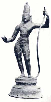 Next to Nataraja, and next only to him, comes Kodanda-Rama as a creation and an achievement or south Indian sculpture. While endless Natarajas, stereotyped in form and expression, though ennobled by masterly craftsmanship, issued almost from every village studio, no Kodanda-Rama seems to have emerged which was not a high-grade product of art. Much fewer in number are the Kodanda-Ramas comparatively, but they rarely degenerate into the angular and gawky figures which sometimes served for Nataraja.