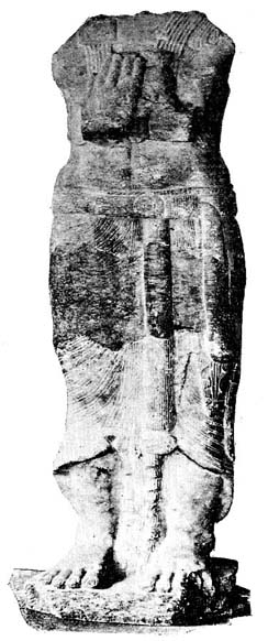 (1) This fine statue seem, to have been at some time broken into a number of pieces: the head and the arms are missing and have not been traced; the two lower pieces have been put together, but with some 'restoration' which we might well have been spared.