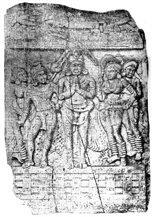 The other [Fig. 2] represents a group, the principal figure in which is a devotee who was, in all probability, a chief of the name of Agheya-Vachakita-Vira. We have only to look at the figure on either side of him to be convinced that the sculptor's aim was individual portraiture.