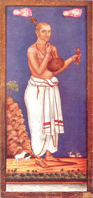 In February 1916, there took place at Gokhale Hall, Madras, the first exhibition of paintings of purely Indian artists. The exhibition was due to the enthusiasm of Dr. J. H. Cousins and other Theosophists at the Theosophical Headquarters, Adyar. At that exhibition, my eye picked out this picture at once, and I began to sing its praises. The owner of the picture, my friend, the late Mr. T. N. Krishnaswami Pillai of the School of Arts, on noting my enthusiasm, promptly presented it to me. He had marked it for sale, and the price was Fifteen Rupees! He told me the picture was of the Tanjore School, but he gave it no name. That name was suggested later, though tentatively.